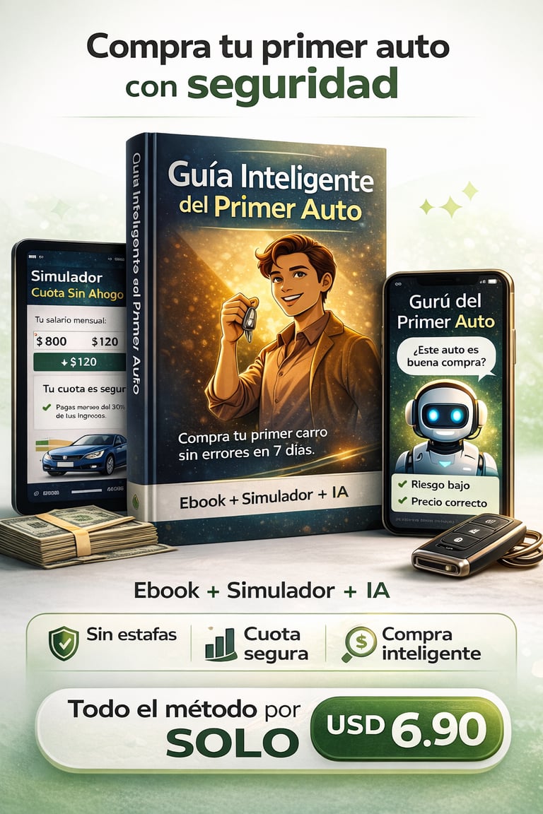 2️⃣ ¿Cómo evitar comprar un auto bomba? La guía entrega el Método Anti-Bomba: checklist visual, prueba de manejo estratégica, investigación de historial e informe obligatorio. El agente de IA acompaña el análisis de tu auto específico. Sin método es suerte. Con método es protección. 3️⃣ ¿Vale la pena financiar? Solo si cumple 4 criterios: tasa baja, buena entrada, plazo corto y cuota dentro del 30%. El simulador revela si vas a pagar el doble. El agente analiza tu propuesta antes de firmar. Lo sabes antes, no lo descubres después.